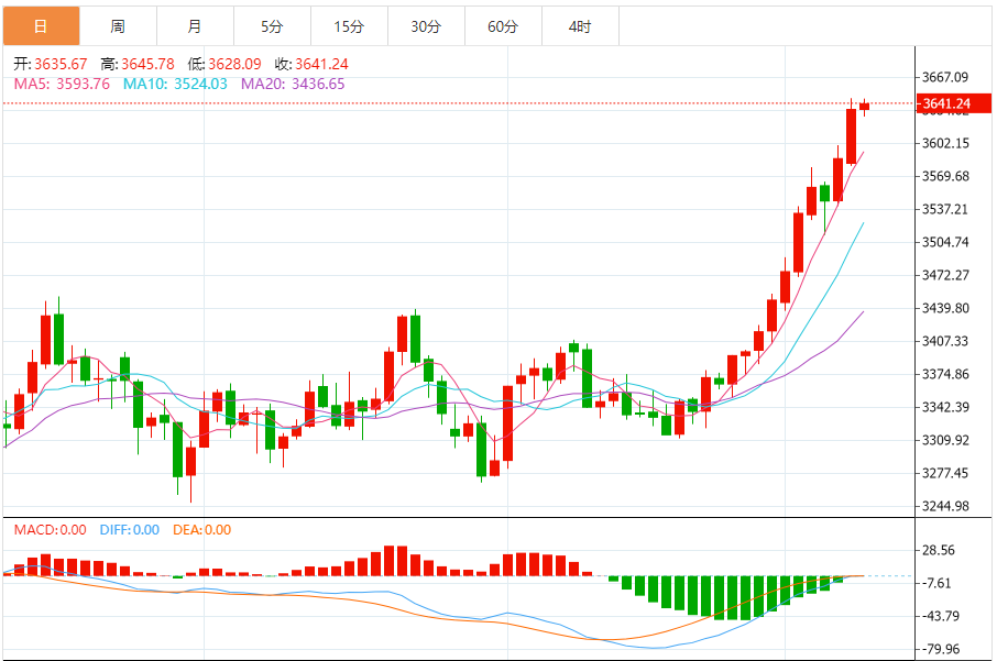 从每日图表来看,价格黄金继续超过最近的短期移动平均线。以伦敦的黄金资本为例,为期5天的移动平均线,10天的移动平均线和20天的移动平均线已长期放置 ,其中10天的移动平均线和20天的移动平均线从最低点到顶部相交,价格始终超过5天的移动平均线 。这表明短期市场的看涨氛围很强,并且是多方的力量。但是 ,随着价格继续上涨,偏差率逐渐上涨,价格远非移动平均水平 ,并且可能对回调有一定的需求。例如,如果价格明显高于五天的移动平均水平,则一些投资者选择获利 ,从而导致价格恢复到移动平均水平 。